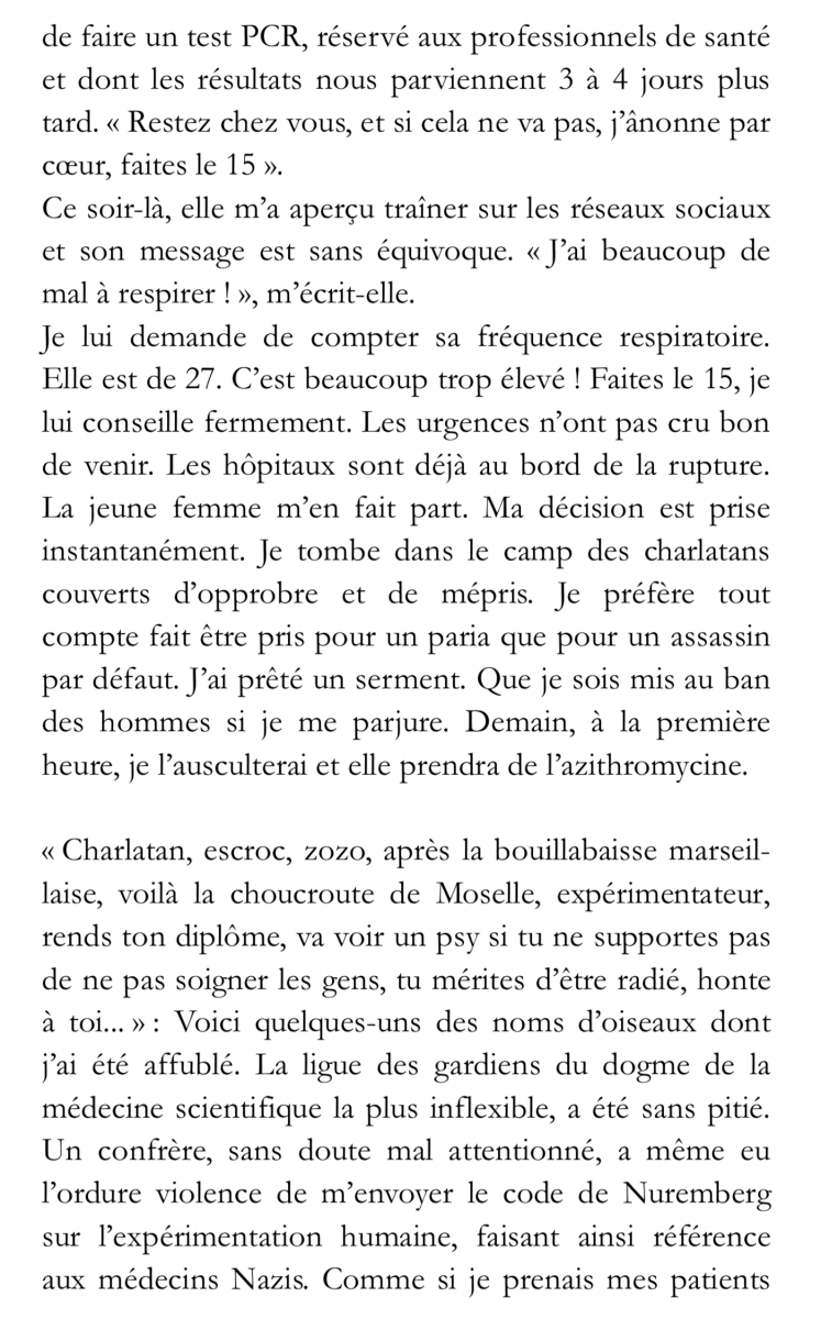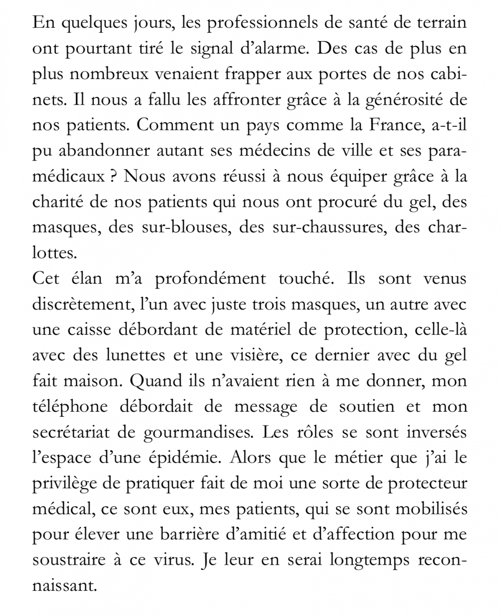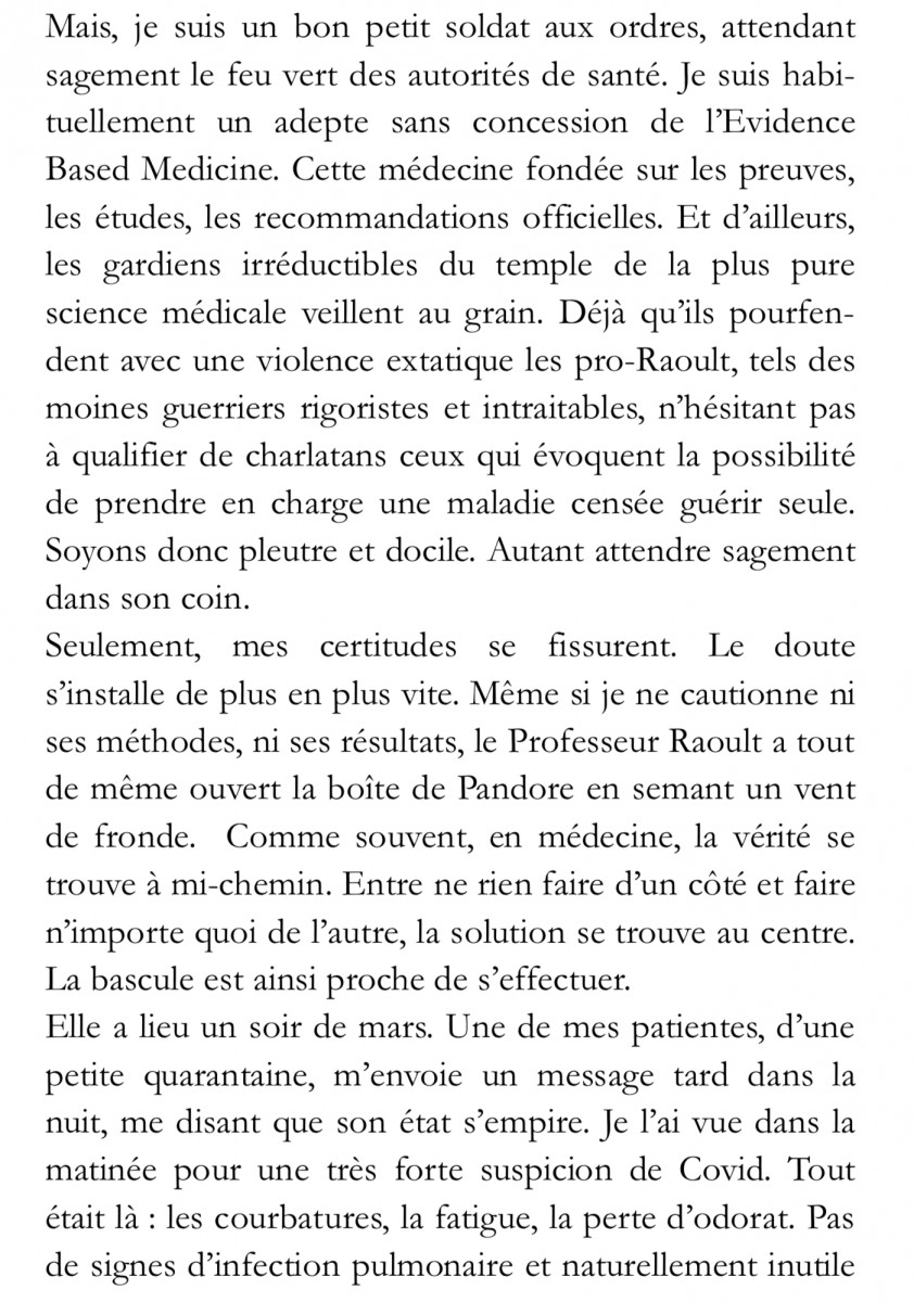 Alors que l’épidémie marque le pas en France, le praticien publie un pamphlet intitulé Je ne pouvais pas les laisser mourir aux éditions JDH. Dans ce récit, il raconte comment il est passé de “bon petit soldat”, “appliquant à la lettre les directives de cette lourde bureaucratie sanitaire ne connaissant absolument rien à la médecine humaine”, à “renégat” après avoir perdu une dizaine de patients, probablement des suites du Covid. Il dénonce dans cet ouvrage l’inaction des autorités sanitaires, brandissant leur dialectique “Paracétamol, domicile, dodo”, les mensonges de l’Etat au sujet des masques notamment, mais aussi le rôle du conseil de l’Ordre des médecins, “censé défendre les médecins” mais les punissant. Extraits.