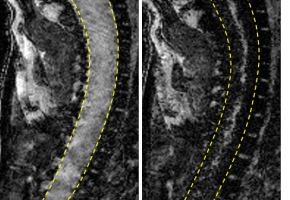 Mercredi 31 mai, se tiendra la Journée mondiale de la sclérose en plaque (SEP), l’occasion pour les associations d’appeler à la mobilisation pour cette maladie neurodégénérative qui touche 100 000 personnes en France et constitue la 1ère cause de handicap non traumatique chez l’adulte jeune. Malgré une évolution en forte progression ces 10 dernières années (4000 nouveaux diagnostics annuels), la maladie reste peu connue, entrainant une errance diagnostic, qui est de 5 ans aujourd’hui. Les associations, et en particulier l’Association française des sclérosés en plaques (Afsep) réclament donc l’obtention du statut de grande cause nationale 2018 et le développement de campagnes d’information et de communication sur ce sujet auprès du grand public. A l’heure actuelle, l’imagerie IRM est largement utilisée pour le diagnostic et le suivi des patients atteints de SEP. Mais des chercheurs français (équipe « SpPrIng » dirigée par Fabian Docagne au sein de l’unité Inserm U1237 de Caen) ont voulu aller plus loin et se sont demandés si cet examen pourrait permettre de prédire l’apparition des poussées. Pour cela, ils ont développé une méthode d’IRM qui permet de suivre dans l’espace et dans le temps l’évolution de la maladie. Elle est basée sur le fait que la sclérose en plaques est due, au moins en partie, au passage de cellules inflammatoires (lymphocytes notamment) dans le cerveau et la moelle épinière à travers la paroi des vaisseaux. Pour pouvoir traverser, les cellules se fixent à des molécules d’adhésion présentes à la surface de vaisseaux sanguins. Les chercheurs ont donc eu l’idée de suivre l’évolution de billes de fer détectables par IRM se fixant sur ces molécules d’adhésion. Ils ont testé cet outil sur des souris présentant un modèle de sclérose en plaques. Dans leur étude, publiée dans la revue Pnas, ils ont montré que l’IRM révèle le passage des cellules inflammatoires et permet ainsi de prédire la survenue d’une poussée chez les souris asymptomatiques et les rémissions chez des souris malades. Les billes de fer sont visualisées en noir, dans la moelle épinière, révélant ainsi une inflammation.