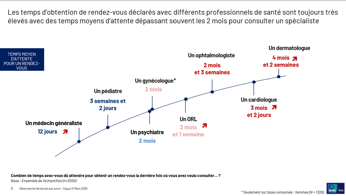 Des délais qui s'allongent considérablement avec les années. En 2019, il fallait 4 jours pour obtenir un rendez-vous chez un généraliste et 2 mois et 2 jours chez un dermatologue. "La seule spécialité pour laquelle les délais ont eu tendance plutôt à s'amoindrir, bien qu'ils restent importants, c'est l'ophtalmologie. On était à 3 mois et une semaine en 2019. On est passé à 2 mois et 3 semaines", a constaté Adélaïde Zulfikarpasic, directrice générale du pôle Société Ipsos, qui a présenté le baromètre pour la FHF.