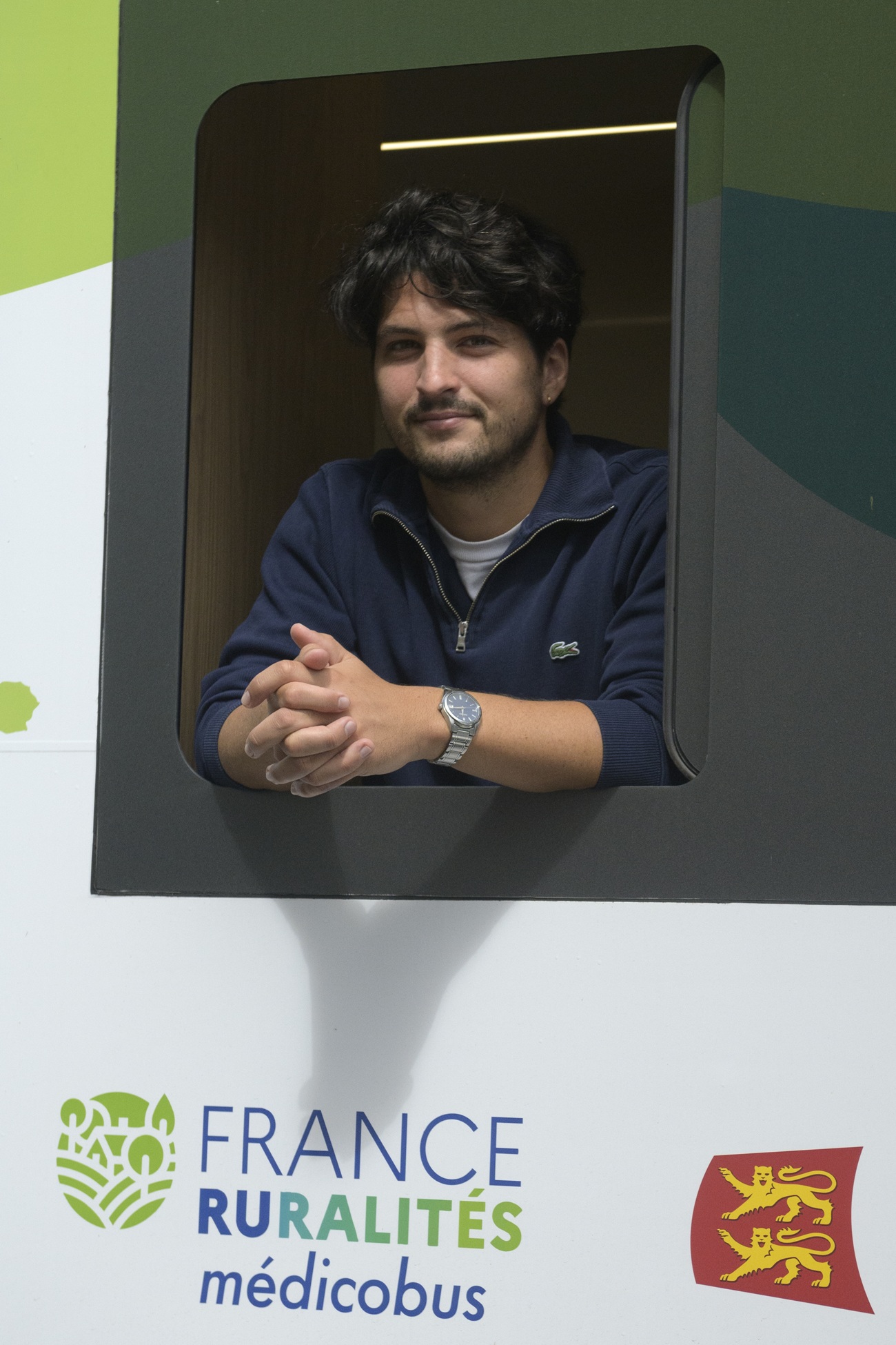 Entre deux consults, le médecin de 28 ans, thésé en janvier, raconte comment il en est arrivé à exercer sur 4 roues. C'est le résultat de la rencontre entre une envie : revenir vivre un peu auprès de sa famille, à Vire. Et une opportunité « atypique, excitante », offerte par l'Intercom : un recrutement au CSI, option médicobus. À ce jour, il a signé 2 CDD pour 2 jours/semaine puis 3 (sur la base de 6200 euros net pour un temps plein). Le reste du temps, il remplace en libéral à Vire, téléconsulte un peu. Cela lui permet de toucher à tout, glaner des idées.