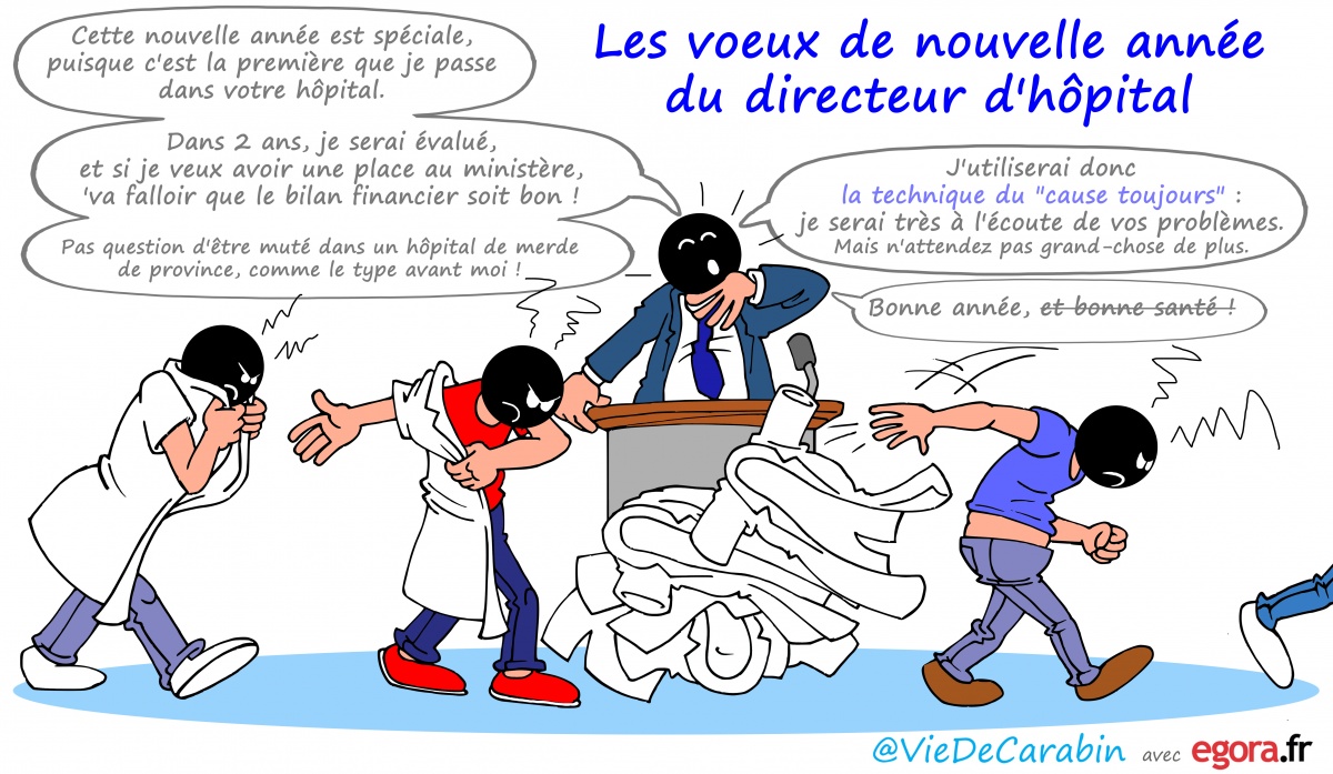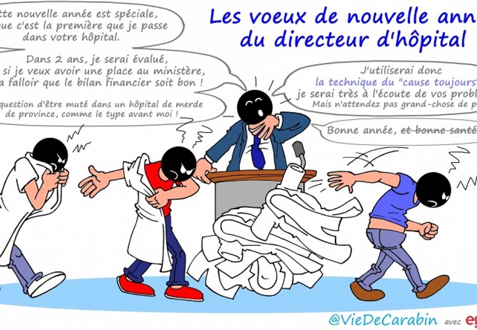 Pour Egora, le dessinateur et interne Vie de Carabin illustre un fait marquant de l'actualité. Cette semaine, c'est sur les images fortes des soignants en colère qui ont jeté leur blouse au nez du directeur de l'hôpital Saint Louis (Paris), alors en plein discours de voeux pour la nouvelle année 2020 qu'il a souhaité revenir.