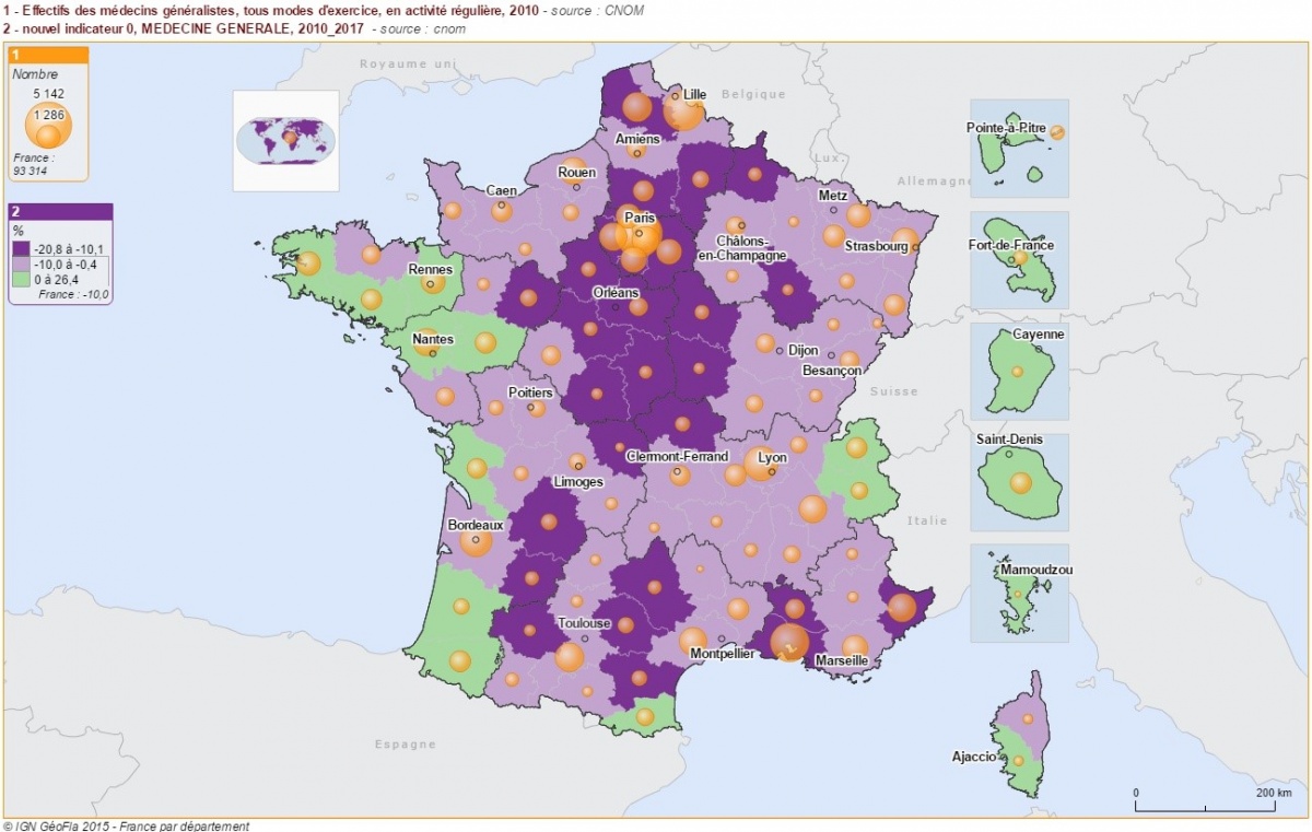 Au 1er janvier 2017, l'Ordre des médecins recensait 287 133 médecins inscrits. "Nous avons aujourd'hui plus de médecins qu'il n'y en a jamais eu", a souligné le Dr Patrick Bouet, président du Cnom, lors de la présentation de sa nouvelle carte interactive de la démographie médicale. Problème: seuls 196 052 sont en "activité régulière" (hors remplaçants et retraités). Et 87 275 seulement exercent dans les territoires en tant que médecins généralistes : c'est 6 000 de moins qu'en 2010. Seuls les départements de la façade atlantique, la Corse du Sud, les Pyrénées orientales, la Savoie, la Haute-Savoie et l'Outre Mer sont bénéficiaires [en vert sur la carte].