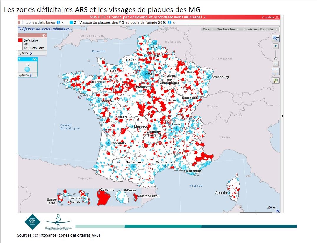 Les médecins étrangers ont limité la casse : 22.400 médecins exerçant une activité régulière au 1er janvier dernier ont obtenu leur diplôme à l'étranger, dont 12 503 hors UE. Soit 11.4% des médecins en activité, contre 7% en 2010. Pour le Cnom, la suppression ou l'augmentation massive du numerus clausus au programme du président Macron n'y changera rien. D'abord parce qu'"on ne peut pas former autant de médecins année par année", pointe son président, et ensuite parce que les "flux" actuels ne jouent pas en faveur des territoires. "Si les flux restent les mêmes, ce n'est pas parce qu'il y aura 20 000 médecins de plus que nous les aurons là où nous en avons besoin", tranche le Dr Bouet. De là à conclure que les dispositifs incitatifs à l'installation mis en place par l'Etat ces dernières années ne fonctionnent pas, il n'y a qu'un pas. Que le Cnom franchit, en livrant une carte montrant d'une part les zones médicalement déficitaires définies il y a 5 ans par les ARS [en rouge sur la carte] et d'autre part, les vissages de plaques en 2016 [en bleu sur la carte]. Le décalage est flagrant.