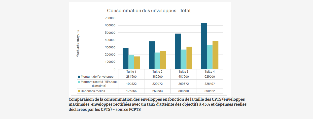 Pour l'enveloppe "Accès aux soins", des différences sont relevées en fonction des régions car les CPTS en Centre-Val de Loire "consomment en moyenne 68.946 euros toutes tailles confondues" et celles en Occitanie "62.418 euros" et en Île-de-France "57.611 euros". Pour l'enveloppe "Parcours", ce sont les CPTS des régions Bretagne (40.263 euros en moyenne) et Hauts-de-France (seulement 15.000 euros en moyenne) qui se démarquent, note l'enquête. Pour la "Prévention", ce sont de nouveau les CPTS bretonnes (30.350 euros en moyenne), Île-de-France (28.678 euros) et Hauts-de-France (seulement 16.925 euros) qui se démarquent.