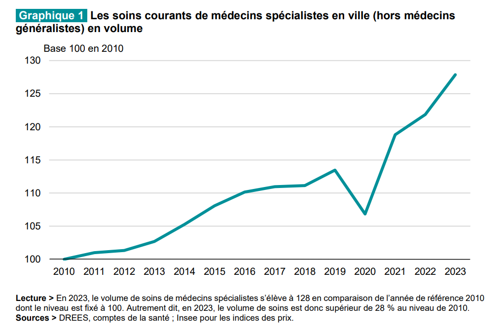 Les dépenses de soins courants fournis par les autres médecins spécialistes de ville sont, elles, très dynamiques : elles ont augmenté de 6.6% en 2023 pour atteindre 14.9 milliards d'euros, après une hausse de 4.4% en 2022.
