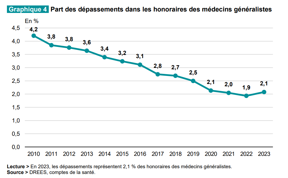 La Drees relève également qu'après 12 ans de baisse continue, qui s'explique par la diminution du nombre de praticiens en secteur 2, les dépassements d'honoraires des généralistes sont repartis à la hausse l'an dernier (+8.3%).