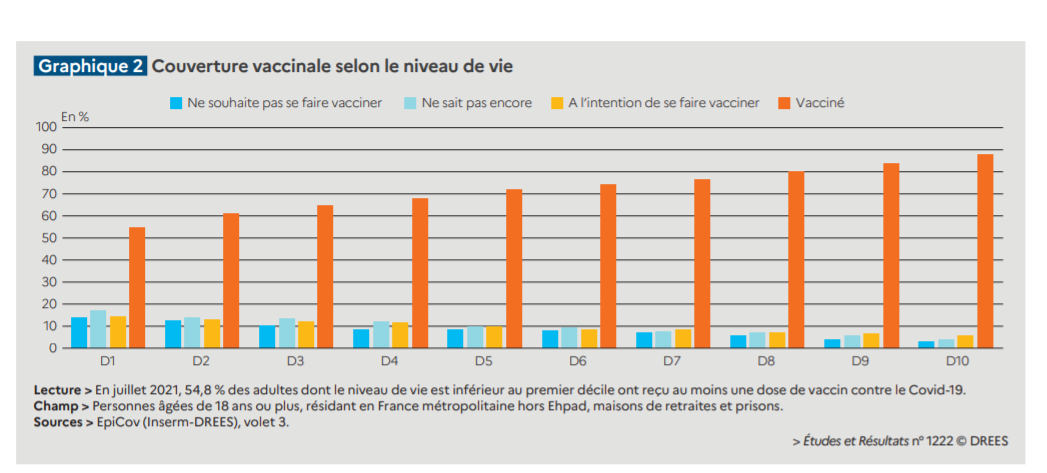 "Le fait d'être vacciné dépend fortement de la position sociale des personnes interrogées (niveau d'études, niveau de vie ou profession)", résume cette enquête qui a porté sur 85.032 personnes majeures du 24 juin au 9 août. Le niveau de vie révèle l’amplitude sociale la plus forte : 55 % des adultes dont le niveau de vie est inférieur au premier décile de niveau de vie (les 10 % de personnes dont le niveau de vie est le plus faible) ont eu recours à la vaccination, contre 88 % des adultes dont le niveau de vie est supérieur au dernier décile (les 10 % les plus aisés), soit plus de 30 points d’écart.