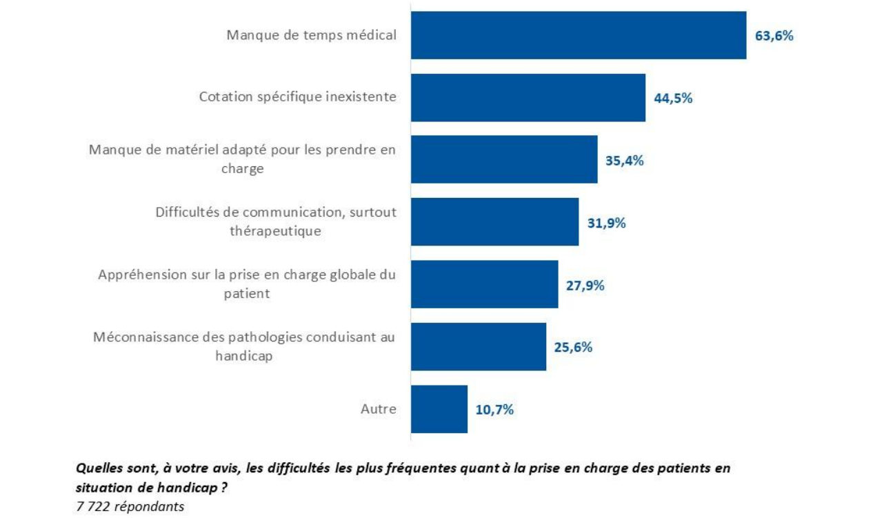 Alors que 76% des médecins ne ressentent aucune difficulté pour recevoir les personnes en situation de handicap, cette prise en charge apparait "difficile" pour 24% des médecins interrogés. Les principales difficultés rencontrées sont dans l’ordre : le manque de temps médical (63,6%), l’inexistence d’une cotation spécifique pour la prise en charge des patients en situation de handicap (44,5%), le manque de matériel adapté (35.4%) ou encore l'appréhension sur la prise en charge globale du patient (27,9%) et la méconnaissance des pathologies spécifiques (25,6%).