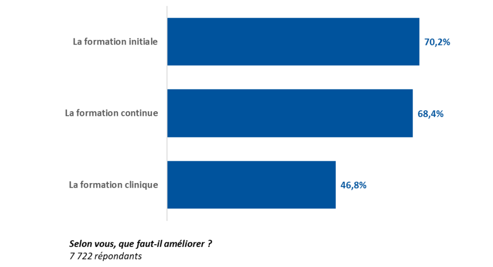 L'Ordre insiste également sur la nécessité de mieux former et sensibiliser les praticiens à la question du handicap. Les praticiens interrogés dans ce rapport jugent insuffisante la formation qu'ils ont reçue pour la prise en charge des patients en situation de handicap. En effet, seuls 23% d'entre eux estiment avoir bénéficié d'une formation théorique satisfaisante. Par ailleurs, 73% des répondants déclarent ne pas avoir reçu de formation clinique à la prise en charge des patients en situation de handicap. "Ces résultats mettent en évidence un besoin important d'amélioration dans l'acquisition des compétences nécessaires pour la prise en charge de cette population spécifique", souligne le document.