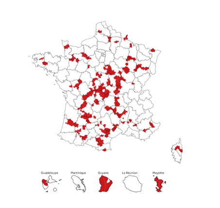 151 intercommunalités ont, en effet, été retenues. Seuls des territoires ruraux ont été sélectionnés, dont une majorité située dans la "diagonale du vie" d'après une cartographie, diffusée par le ministère de la Santé en début d'après-midi. Une partie des départements de l'Yonne, du Loiret, de la Nièvre, du Cher ou de la Creuse sont ainsi concernés. Certaines zones sont également indiquées comme prioritaires en Charente, Dordogne et dans le Lot-et-Garonne. Dans le Sud-Ouest, les départements de l'Aude, de l'Ariège et des Landes sont aussi concernés. Les départements d'Outre-mer sont aussi visés, avec l'ensemble du territoire de Mayotte concerné par la mission de solidarité, et la quasi-totalité de la Guyane.