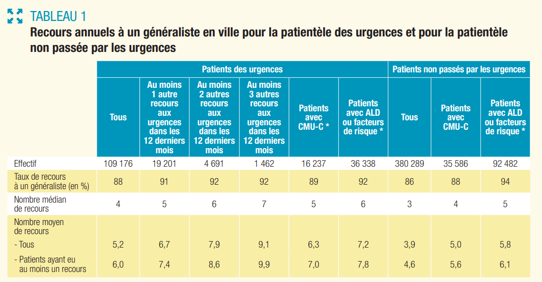 amont de leur passage aux urgences. Parmi les patients des urgences ayant consulté un généraliste, le nombre moyen de recours s’élève à 6,0 dans les douze derniers mois. Enfin, le nombre de patients venus à plusieurs reprises aux urgences sans recours à la médecine de ville est très faible : 9% d’entre eux n’ont consulté ni un généraliste ni un spécialiste dans les 12 mois. 17% des patients des urgences ont également déclaré avoir vu un généraliste la semaine qui a précédé leur passage aux urgences. “. Leurs recours à la médecine de ville ont été deux fois plus souvent associés à des majorations pour consultation en urgences, consultation de nuit ou consultation le dimanche, que pour la patientèle non passée par les urgences”, note la Drees.