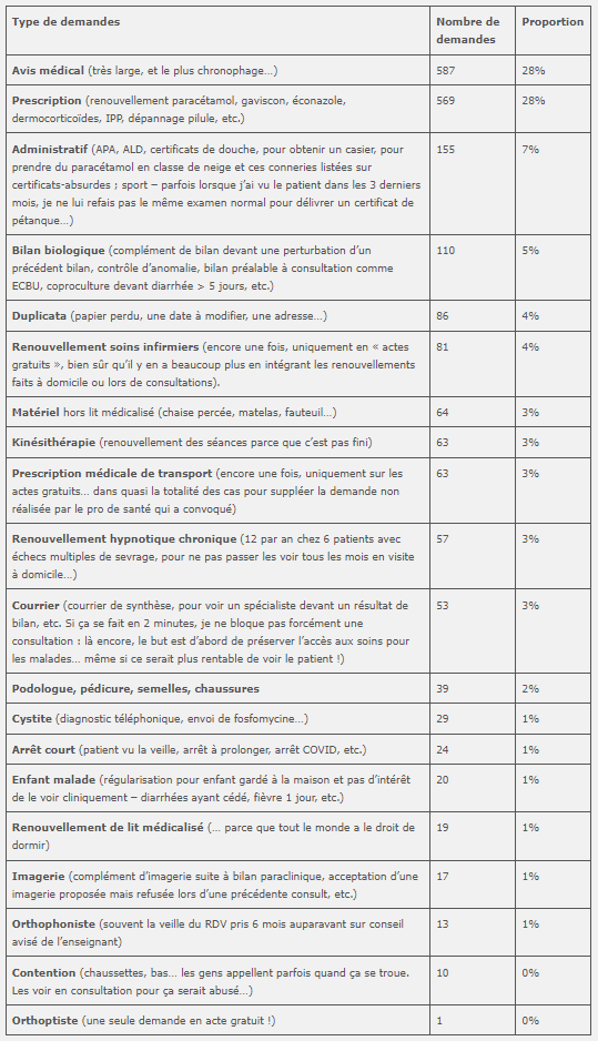 Même s’il est convaincu qu’un secrétariat “peut filtrer une partie de ces demandes”, il ne pense pas que ce soit la solution miracle. “Il faudra tout de même que les papiers soient imprimés ou signés, lors d’une consultation ou d’une téléconsultation, écrit-il, ce qui allonge forcément le temps consacré pour répondre à une demande”. Lui confie bénéficier d’un télésecrétariat, pourtant il ne lui permet de réduire ses “actes gratuits”. “Ca me fait des notes à consulter en fin de journée, au lieu de les traiter au fil de l’eau toute la journée, et finalement je trouve ça plus angoissant de devoir lire des notes régulièrement sur une discussion entre patient-télésecrétaire, plutôt que de la vivre au moment donné ou en écoutant un message vocal”, témoigne-il. 86 heures consacrées aux “actes gratuits” depuis janvier Lors d’un précédent billet de blog, le médecin s’était intéressé à évaluer le temps moyen passé pour un “acte gratuit” Résultat : 2,5 minutes en moyenne, même s’il rappelle que ce temps dépend de sa “vitesse de frappe au clavier, des paramétrages de son logiciel…” Sur un peu plus des huit premiers mois de septembre, il estime ce temps à 5 150 minutes, soit 86 heures à n’effectuer que des “actes gratuits”. Le médecin a aussi analysé les demandes de ses patients, qu’il a récapitulées dans le tableau ci-dessous. Les principaux “actes gratuits” concernent les avis médicaux (28%) et les prescriptions (comme des renouvellement de paracétamol, gaviscon, éconazole, dermocorticoïdes, IPP, dépannage pilule …) (28%).