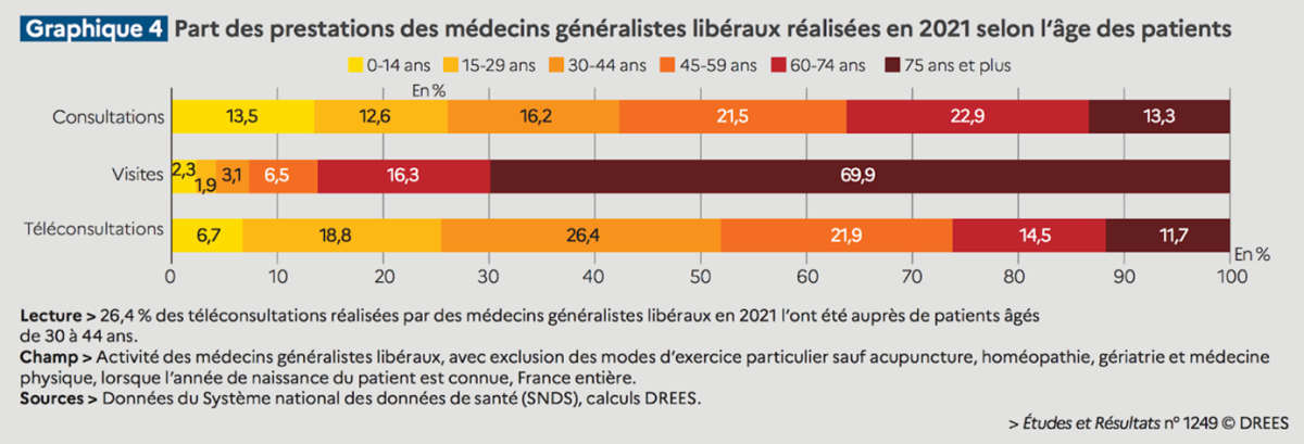 Ce sont les médecins exerçant dans les territoires urbains, et notamment dans la région francilienne, qui téléconsultent le plus. En Île-de-France, 8% de l’activité des généralistes libéraux correspond à des consultations à distance, contre 2% dans les territoires ruraux hors outre-mer, par exemple. Par ailleurs, la Drees calcule que les praticiens exerçant en groupe sont les plus nombreux à déclarer une activité de téléconsultation (85% contre 59% pour ceux exerçant seuls). Des patientes majoritairement féminines “Par rapport à celles réalisées en cabinet, les consultations à distance s’adressent davantage à des patientes, quel que soit leur territoire de résidence”, indique aussi la Drees dans son enquête. En effet, 62% des téléconsultations de 2021 concernaient des femmes alors que cette même patientèle représente habituellement 57% des consultations en cabinet. Là aussi, la patientèle est plutôt jeune, souligne l’institut. Près de la moitié (45%) des consultations en distanciel ont été réalisées avec des patients âgés de 15 à 44 ans alors que cette patientèle représente 29% de l’activité du cabinet. La téléconsultation est enfin plutôt plébiscitée par les patients les moins précaires. En cabinet, en 2021, la part des personnes ayant recours à la complémentaire santé solidaire (CSS) était de 19%, quand ce pourcentage était de 12% dans le cadre de la téléconsultation.