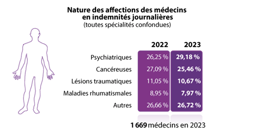 La Carmf indique que le nombre de médecins bénéficiaires des indemnités journalières a été stable en 2023 par rapport à 2022, passant de 1 665 à 1 669, "mais toujours en forte baisse comparé aux années record à cause de la Covid", précise-t-elle. La Caisse relève, dans les affections des médecins – toutes spécialités confondues – en arrêt une prépondérance des motifs psychiatriques (29,18%), en hausse par rapport à 2022 (26,25%). Celles-ci sont suivies des affections cancéreuses (25,46%) et des lésions traumatiques (10,67%). Viennent ensuite les maladies rhumatismales (7,97%) et d'autres affections (26,72%) qui ne sont pas précisées.