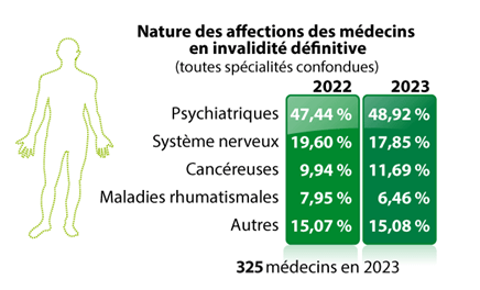 S'agissant des médecins invalides, en 2023, "et comme ces trois dernières années", les troubles psychiatriques constituent largement la première cause d'invalidité définitive (48,92% en 2023 vs 47,44% en 2022), suivis des maladies du système nerveux (17,85%) et des maladies cancéreuses (11,69%). Les maladies rhumatismales prennent la quatrième place des affections les plus fréquentes chez les praticiens invalides.