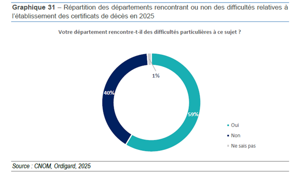 Dans son rapport annuel sur la permanence des soins ambulatoires (PDSA), le Conseil national de l'Ordre des médecins rapporte que 59% des conseils départementaux rencontrent des difficultés relatives à l'établissement des certificats de décès.