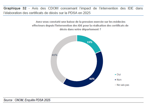 En 2025, 59 % des CDOM ont déclaré rencontrer des difficultés particulières liées à l'établissement des certificats de décès. Ils étaient 67 % en 2024, ce qui traduit une légère amélioration probablement en partie expliquée par l'autorisation définitive accordée aux infirmières volontaires à signer ces certificats. Interrogés sur l'éventuelle diminution de la "pression" pesant sur les médecins effecteurs depuis l'entrée en vigueur de cette disposition, seuls 19 % des CDOM ont estimé que l'intervention des IDE avait permis une réelle baisse de sollicitations des médecins.