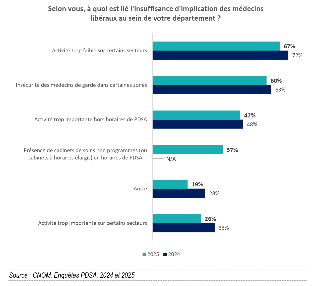 Les départements ayant déclaré rencontrer des difficultés dans le fonctionnement de la PDSA ont notamment pointé des problématiques liées à la démographie médicale avec une densité de praticiens insuffisante ainsi que le vieillissement de la population médicale en exercice. L’implication insuffisante des médecins libéraux est également en cause : ce constat a été dressé par 43 départements en 2025, contre 46 en 2024. Ce manque d’engagement s’explique principalement par une activité trop faible sur certains secteurs en horaires de PDSA (67%), l'insécurité des médecins de garde dans certaines zones (60%), une activité trop importante hors horaires de PDSA (47%) ou encore la présence de cabinets de soins non programmés en horaires de PDSA (37 %). A contrario, une activité trop importante sur certains secteurs en horaires de PDSA a été soulignée dans 26 % des cas.