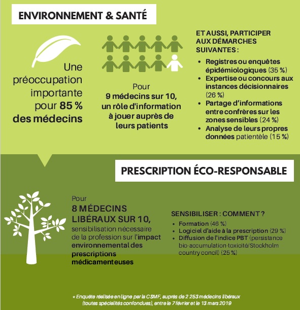 Le gros des médecins a-t-il été formé à ces problématiques ? Non. Ça veut dire qu’ils en ont certainement besoin. Par exemple, notre organisme de DPC possède une formation sur les perturbateurs endocriniens. C’est une des plus demandées et des plus suivies de notre catalogue ! C'est toujours difficile à mesurer mais le fait d’être sensibilisé à des impacts environnementaux a indiscutablement un impact sur la pratique quotidienne et la prescription.   Vous évoquez plusieurs propositions pour permettre aux médecins de s'engager.   Il serait intéressant qu’on reconnaisse aux médecins un rôle d’information auprès des patients ainsi qu'une place dans les instances de décisions locales : territoires, mairies, collectivités. Par ailleurs, on voit bien que dans un certain nombre de territoires sont apparues des fréquences élevées de telle ou telle pathologie, comme le cancer de la prostate avec le chlordécone ou les agénésies chez l’enfant en Bretagne et Loire Atlantique… On constate tout ça et on ne sait pas trop comment s'en emparer. Il serait intéressant d’encourager les médecins à participer à des registres épidémiologiques.   Sur quels réseaux et acteurs s'appuyer ? Il y a plusieurs niveaux. Les pouvoirs publics (caisses d'assurance maladie, Santé publique France…) ont énormément de données de santé très sous-exploitées, ce qui pose un vrai problème d'exploitation en matière de santé publique. Ça va peut-être changer avec le "health data hub" et la stratégie santé numérique. Par ailleurs, les sociétés savantes peuvent être des acteurs pour élaborer des thématiques et structurer des registres.   Et les syndicats ? Les corps professionnels ont un rôle à jouer pour sensibiliser les médecins au plus près de lieux d’exercice et favoriser leur implication. Mais il faut réfléchir pour que ce ne soit pas encore de la paperasse, sans quoi ça ne marchera pas. Il faut quelque chose de simple et souple que les médecins puissent intégrer dans leur pratique quotidienne. Avec les logiciels métiers ce devrait être faisable, quitte à prévoir un forfait individuel adapté pour dédommager le temps (réduit) passé à alimenter des registres ou partager ses données de patientèle.   * Enquête réalisée par la CSMF auprès de 2253 médecins libéraux toutes spécialités confondues entre le 7 février et le 13 mars 2019, par questionnaire en ligne.