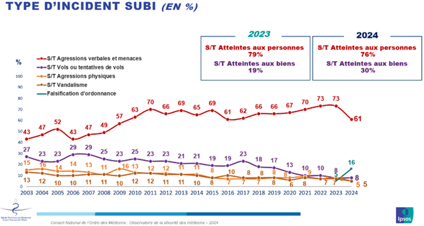 Les atteintes aux biens (vols, vandalisme) représentent environ 2 incidents sur 10. Les objets les plus volés sont des outils directement liés à l’exercice : ordonnances, tampons, cartes professionnelles... À eux seuls, ils expliquent une partie croissante des déclarations. La falsification de documents, jusque-là marginale, est en très forte hausse en 2024. Elle représente plus d’un quart des incidents déclarés. "On peut espérer qu'avec les ordonnances numériques", ce "type d'incidents évoluent favorablement", commente le Dr Avrane.