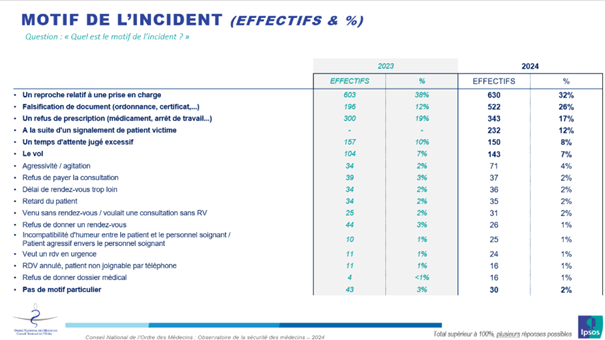 Un reproche relatif à une prise en charge est le principal motif d'agression signalé (32%). Parmi les autres motifs, on retrouve la falsification de documents (ordonnances, certificats), le refus de prescription d'ordonnance ou de certificat, ou encore le temps d'attente.