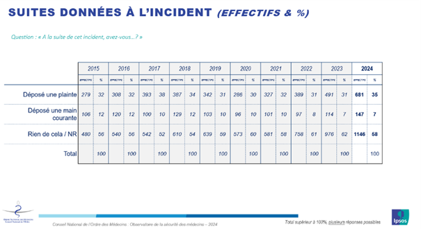 Bien que faible, le nombre de plaintes déposées après un incident est en légère augmentation. Ainsi, 681 plaintes ont été déposées en 2024, soit 35% des actes signalés. Une hausse de quatre point par rapport à 2023. 190 plaintes supplémentaires ont ainsi été déposées. "Je me satisfaits de cette augmentation, il y a eu une prise de conscience", se félicite le Dr Avrane, qui martèle chaque année l'importance de porter plainte. "Ça n'est pas forcément pour être sévère mais pour marquer le coup et que cette courbe qui ne cesse d'augmenter commence à diminuer. Il faut agir pour casser cette spirale de la violences", ajoute-t-il. Pourtant, 58% des praticiens admettent ne pas donner de suite aux actes de violences rencontrés.