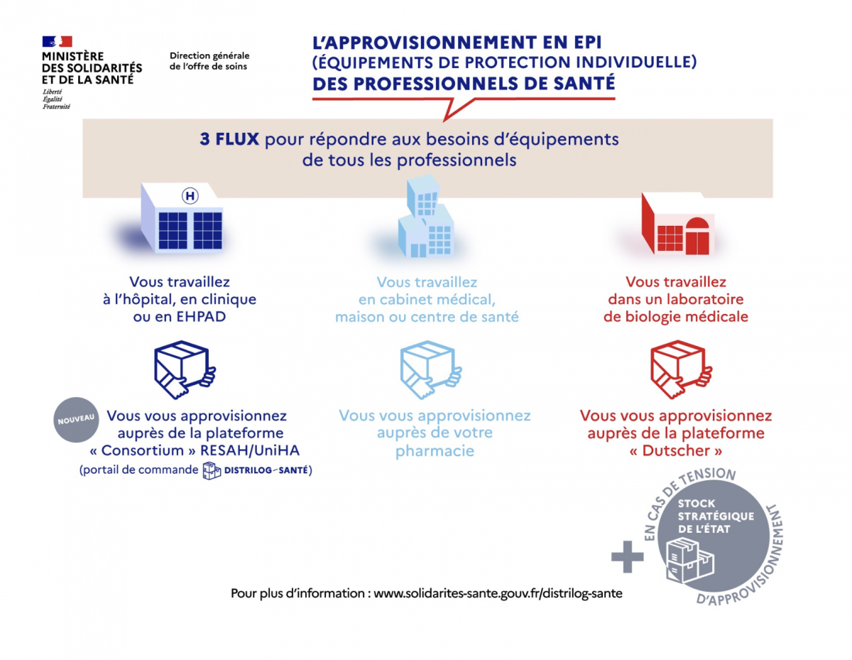 Dans l’hypothèse où certains stocks seraient en tension, et que les dotations gratuites par l’État reprendraient, les professionnels de santé libéraux auront dans ce cas la possibilité de passer directement par Distrilog Santé pour se fournir.