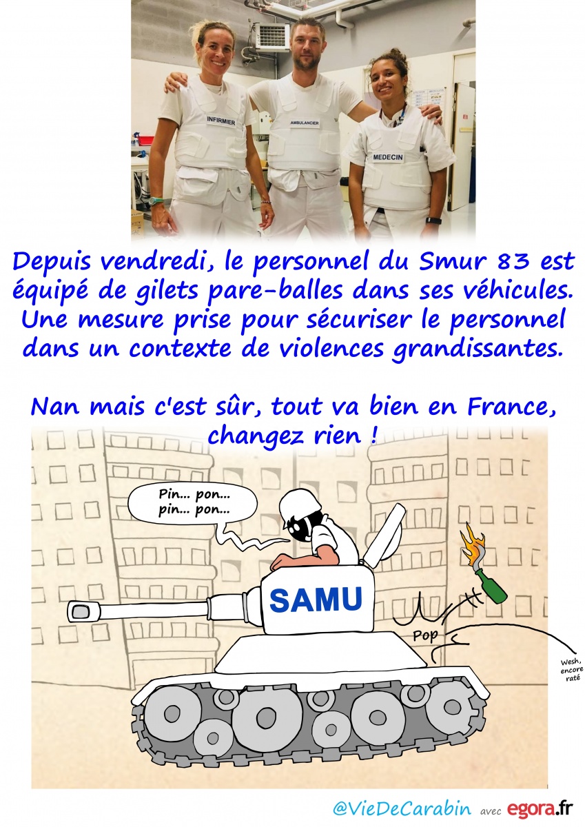 L'agression mortelle à l'arme blanche d'un pompier du Val-de-Marne, le 4 septembre, alors qu'il intervenait au domicile d'un patient schizophrène en crise, montre que le danger est réel pour les secouristes. "Pour davantage de protection, il a été demandé à la direction d'investir dans des gilets pare-balle", indique le communiqué du Samu 83. Trois équipages de garde -deux à Toulon, l'une à la Seyne-sur-Mer- sont désormais équipés de lots de trois gilets pare balle identifiés "médecin", "infirmier" et "ambulancier". Il est "fortement recommandé" aux soignants de s'en "équiper préventivement au départ de toutes les missions SMUR à haut risque potentiel".