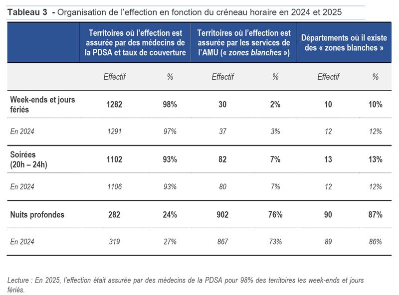 Si la couverture territoriale par la PDSA s'améliore légèrement les week-end et jours fériés (+1 point) et demeure stable en soirées (93% de territoires couverts), elle se dégrade encore en nuit profonde, montre l'enquête. En 2025, la PDSA était assurée de minuit à 8 heures dans 24% des territoires de garde seulement, contre 27% l'année précédente.