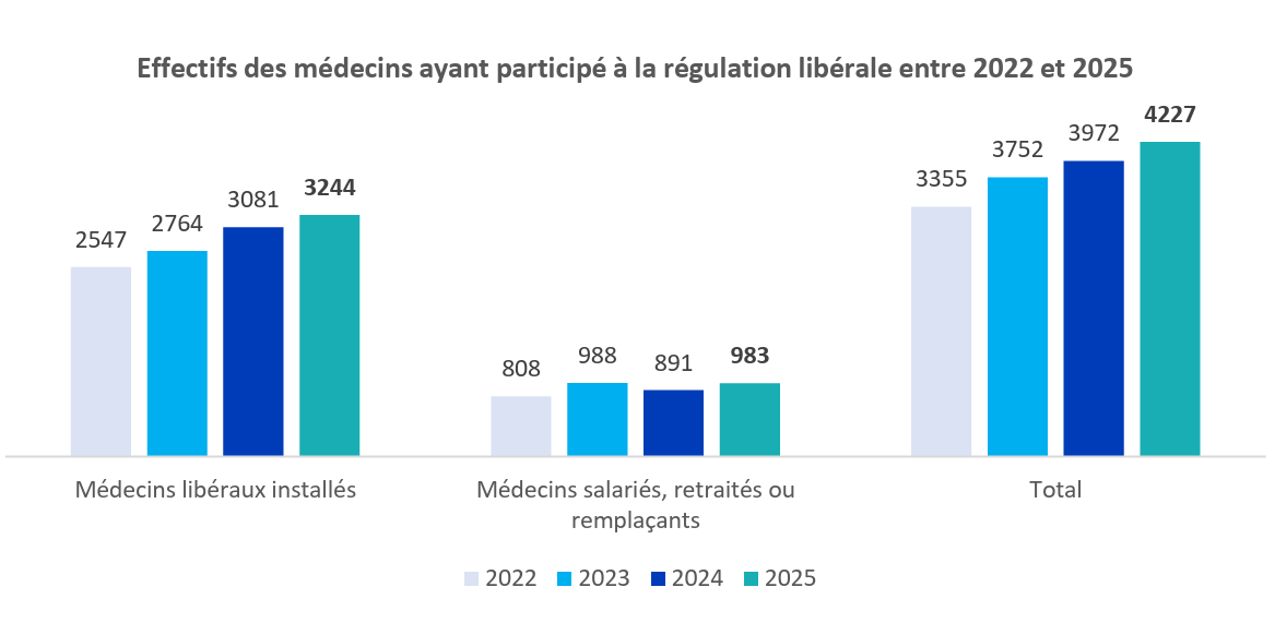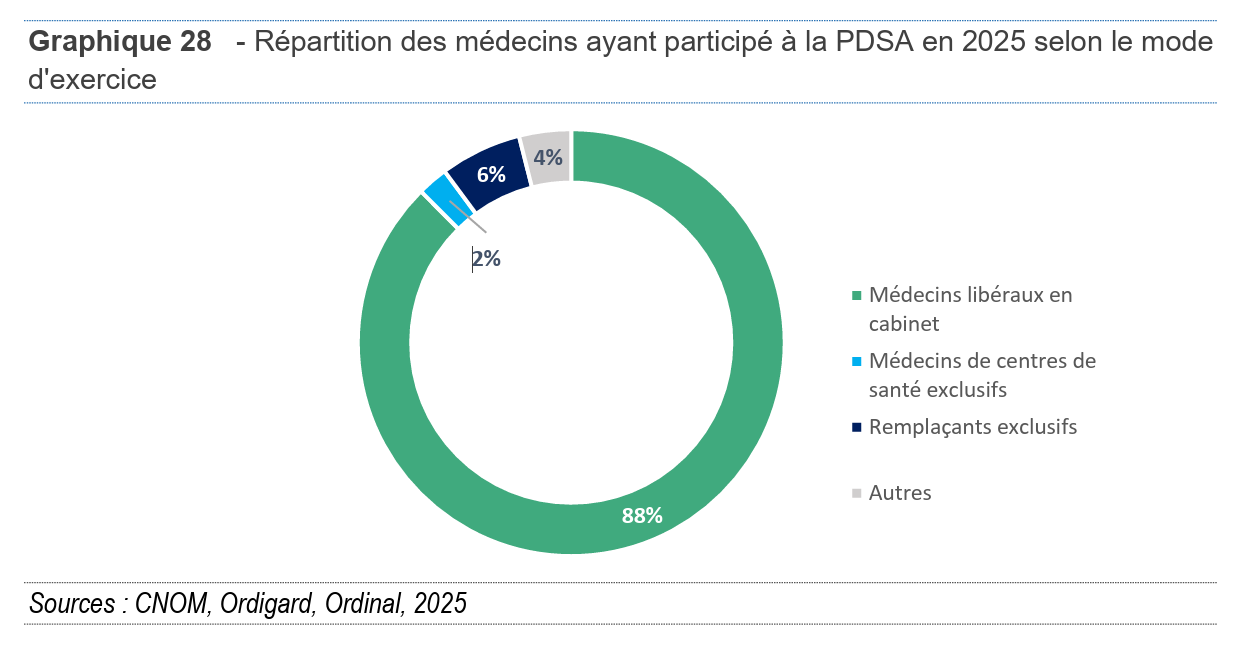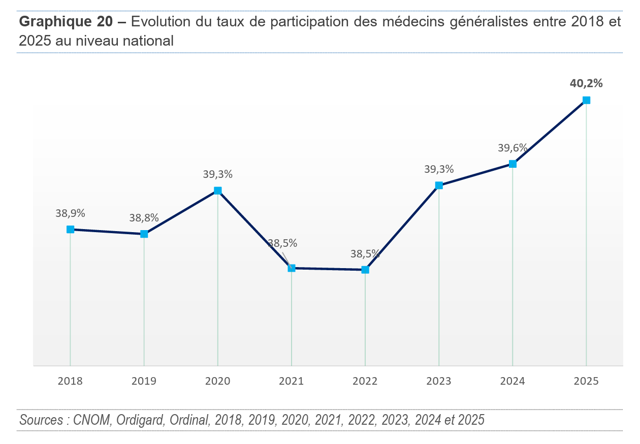 Le taux de participation des généralistes à la PDSA poursuit sa hausse, atteignant 40.2% en 2025 contre 39.56% l'année précédente et 38.5% en 2022. Au total, 26 690 médecins ont pris part à la PDSA parmi les 66 394 médecins susceptibles d’assurer des gardes.