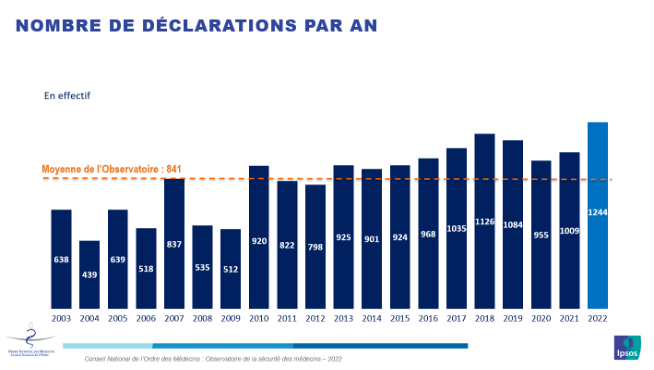 1 244 signalements au Conseil national de l’Ordre des médecins (Cnom). Ce chiffre n’a jamais été aussi élevé depuis 2003, date de la création de l'observatoire sur la sécurité des médecins, par le Cnom, en collaboration avec Ipsos. C’est une augmentation de 23% par rapport aux chiffres de l’année 2021. Ceux des années précédentes avoisinaient les 1 000 signalements. Pour le Dr Jean-Jacques Avrane, délégué chargé de l’Observatoire sur la sécurité des médecins, cela peut venir du fait que 2022 est la première année sans confinement depuis le Covid-19. Mais, il reste bien plus mesuré quant aux chiffres avancés. “Ces déclarations ne sont pas obligatoires. Les médecins n’ont pas le réflexe de déclarer ces incidents”, confie-t-il, en ajoutant que certains soignants “hésitent” à faire remonter ces informations. “Tous les résultats sont sous-évalués néanmoins ça nous donne une image pertinente du type de violences que nous pouvons rencontrer”, assure le médecin.