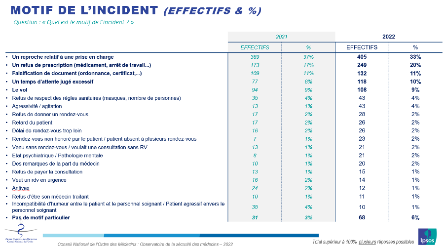 Dans 73% des cas, les médecins rapportent des agressions verbales et des menaces, qui sont en nette progression depuis 2021, passant de 710 à 906 médecins agressés ou menacés cette année. S’en suivent les vols dans 10% des cas. Le principal motif évoqué par les médecins vient d’un reproche fait sur une prise en charge (33%) et un refus de prescription (20%).