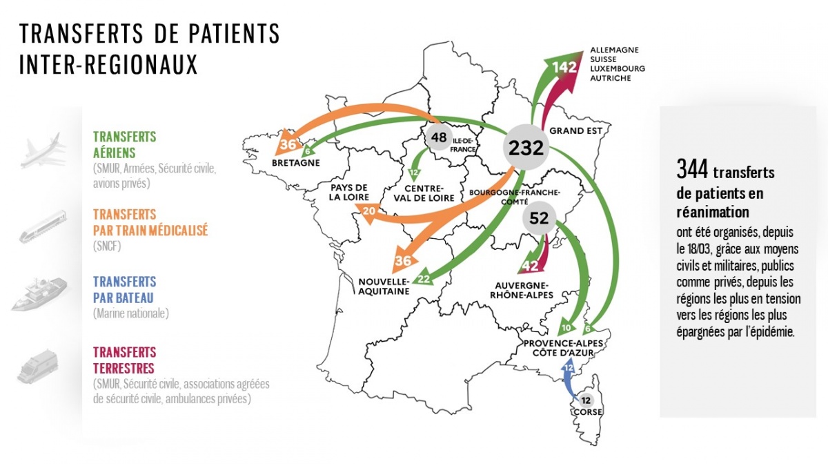 Depuis le 18 mars, 344 patients hospitalisés en réanimation dans des régions en tension ont pu bénéficier d’un transfert vers d’autres régions françaises ou des pays frontaliers. La direction générale de la Santé a, par ailleurs, publié une carte retraçant ces différents transferts réalisés en car ou en TGV médicalisé, en hélicoptère ou avion militaire, par bateau grâce à la marine nationale ou en véhicule. La majeure partie de ces transferts ont été réalisés pour désengorger les services des hôpitaux du Grand Est, où plus de 1.500 personnes ont succombé au Covid-19. Cette donnée comprend également les décès dans les Ehpad. Ces patients ont été transférés pour bon nombre vers l’Allemagne, la Suisse, le Luxembourg ou, plus récemment l’Autriche. Florence Parly, ministre des Armées, ainsi que Christophe Lannelongue, directeur de l’ARS Grand Est, ont tenu à remercier tous ceux qui sont venus en aide à la région. "Nous ouvrirons nos capacités de réanimation dès le début du mois de mai pour nos amis", a déclaré ce dernier.