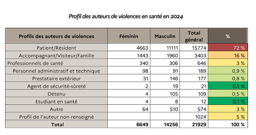 Dans la plupart des cas, ces violences sont commises par des patients ou des résidents (autour de 70 % des signalements), mais de nombreux actes sont aussi commis par les accompagnants, visiteurs et membres de la famille (16 % en 2024). Dans près de deux tiers des cas, les victimes sont des infirmières ou des aides-soignantes, le plus souvent des femmes.