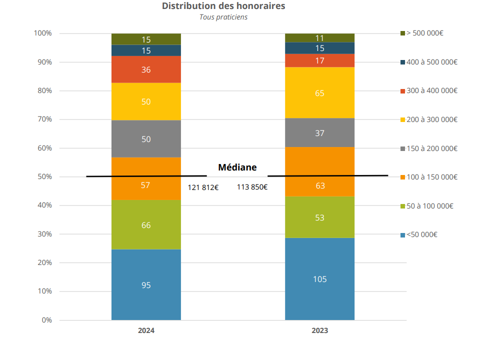 Comme les médecins de ville, les praticiens hospitaliers doivent fixer leurs honoraires avec "tact et mesure". En 2024, la moyenne des honoraires se situe à 168 870 euros et la médiane à 121 812 euros, des valeurs en progression de 7% par rapport à 2023 tous praticiens confondus, mais relativement stables (+0,8% et -1,2%, respectivement) si l'on ne prend en compte en 2023 que les praticiens qui sont autorisés à une activité libérale en 2024. "A priori, la dynamique individuelle est donc plutôt contenue et la progression globale des honoraires pourrait s'expliquer par le volume des nouveaux entrants", avance le rapport. Si l'on ne retient que les praticiens qui ont effectivement facturé des honoraires en 2024, la moyenne monte à 183 130 euros (+3%) et la médiane à 136 527 euros (+2%).