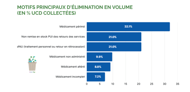 Les médicaments périmés représentent plus d'un tiers des médicaments éliminés. Environ 20% des médicaments éliminés sont consommables, mais ne sont pas utilisés par les services de soins car ils n'ont pas été remis dans le stock de la pharmacie de l'établissement.