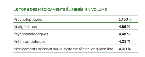 Les médicaments les plus éliminés sont les psycholeptiques (13,53%), les analgésiques (4,86%) et les psychoanaleptiques (4,48%), selon l'étude.
