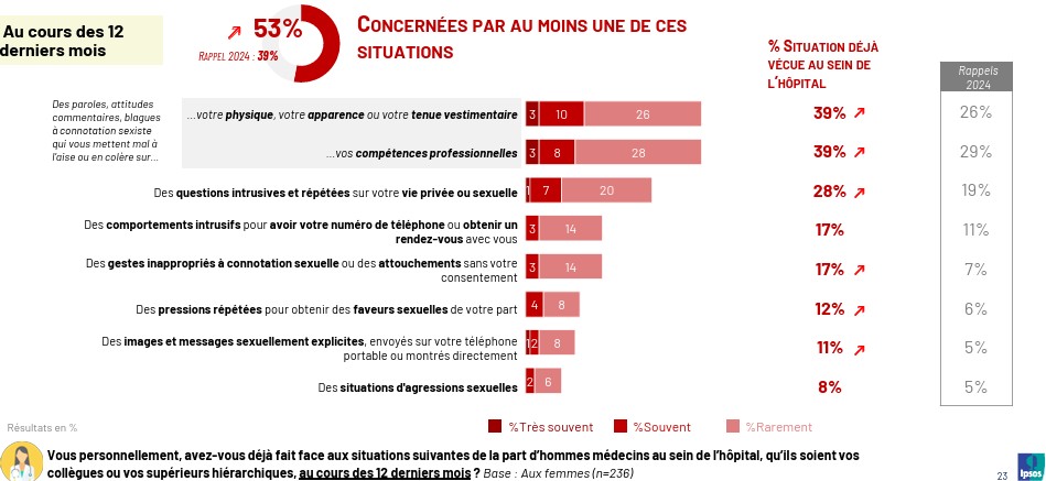 Selon le baromètre, les femmes médecins ont dénoncé "un nombre beaucoup plus élevé" de comportements sexistes et agressions sexuelles en 2024. Plus de la moitié (53%) d'entre elles affirment avoir été victimes de telles violences au cours des douze derniers mois, contre 39% l'an dernier. Une hausse qui pourrait s'expliquer par "une meilleure prise de conscience que ces situations ne sont plus acceptables", notent les auteurs du baromètre.