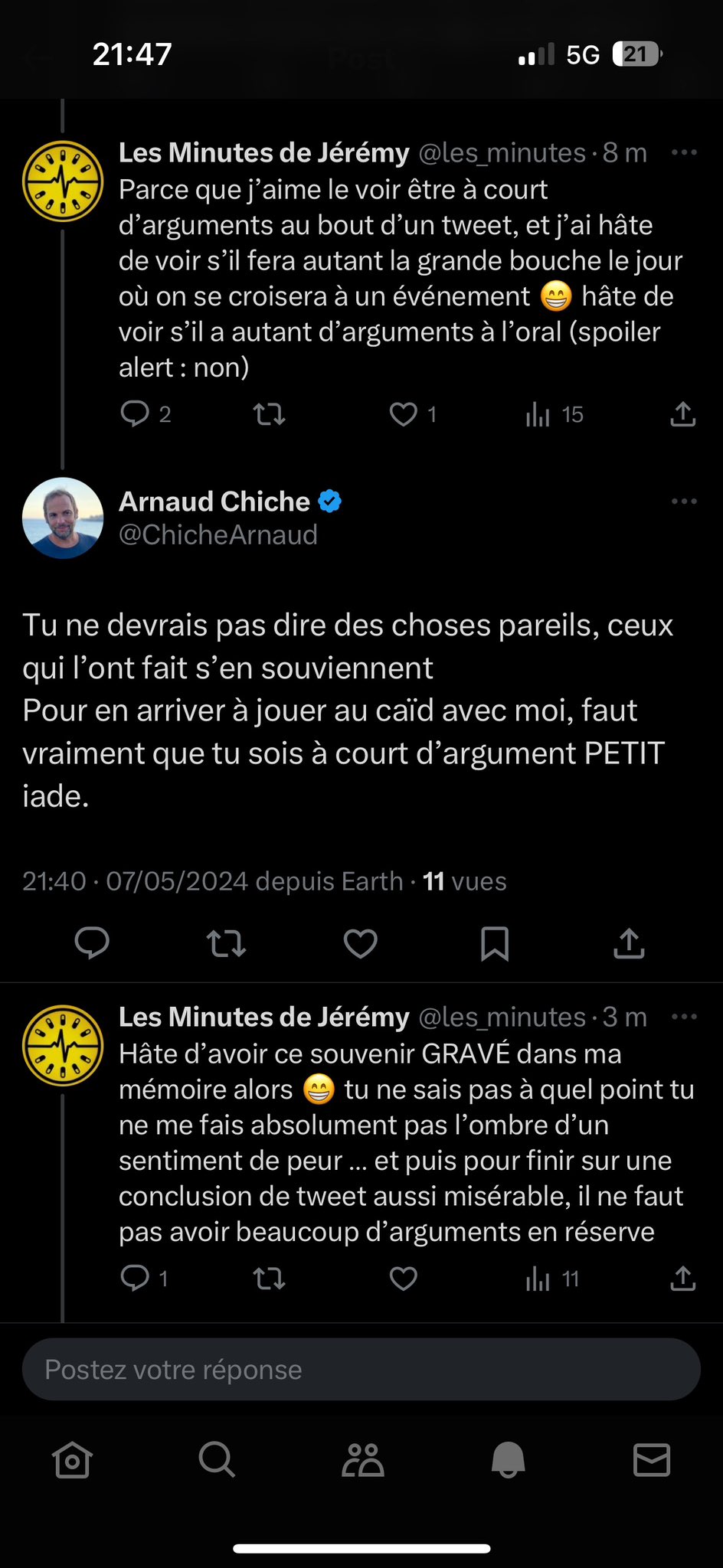 "Dans les suites immédiates de cela, le cyberharcèlement commence. Des comptes parfois anonymes se mettent à me cibler sur le réseau X", relate Arnaud Chiche, qui évoque "des insanités, des attaques, de la menace, de l'intimidation". "Je suis en vacances en famille, je consulte un peu mes réseaux sociaux entre la plage et la paillotte et je vois que je suis attaqué de tous les côtés… j'ai le malheur de répondre un peu, se défend-t-il. Dans les tweets que vous avez sous les yeux, il n'y a pas d'insultes, il n'y a pas de vulgarité. Il y a du mépris et de la véhémence. Je n'aurais probablement pas dû répondre comme ça… Mais vous savez quand vous êtes cyberharcelé c'est compliqué, c'est comme si vous disiez à un petit garçon qui est harcelé à l'école qu'il aurait mieux fait de pas donner un coup de poing quand il s'en pris 10 : c'est la même chose."