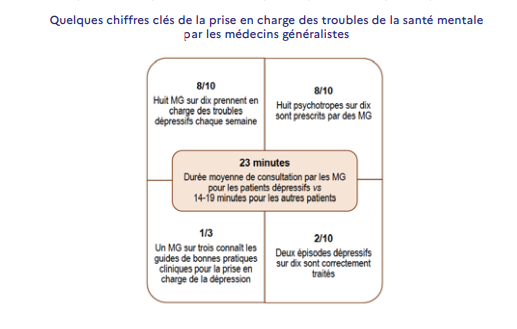 "Avec une consultation d’une durée moyenne de 16 minutes, une formation dédiée aux troubles psychiques quasi-inexistante et une absence de liens directs avec les psychiatres, l’intégration des médecins généralistes au sein de la chaîne de soins est encore insuffisante, déplore le HCP. Pour autant, le généraliste jouit d’un capital de confiance important auprès de ses patients qui auront tendance à préférer que ce soit lui qui prenne en charge leurs troubles psychiques, ce qui peut s’avérer à la fois moins stigmatisant et beaucoup plus rapide que de se diriger vers un spécialiste."