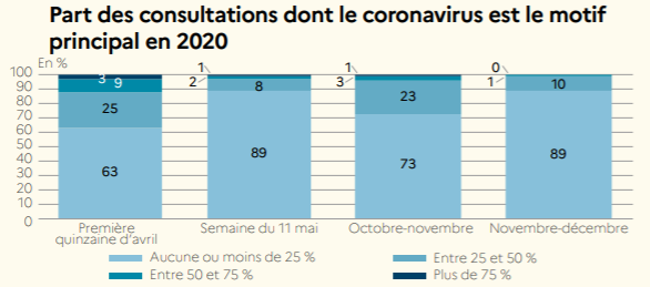 Source : Drees, quatrième Panel d’observation des pratiques et des conditions d’exercice en médecine générale. Les consultations pour infection urinaire chez la femme et la prise en charge de douleurs thoraciques aiguës ont été aussi fréquentes que lors d’une semaine ordinaire, avant l’épidémie. A la différence des suivis pédiatriques et les consultations de suivi ou de renouvellement d’ordonnance pour les patients chroniques, moins fréquents dans l’activité des généralistes en novembre et décembre car plus souvent reportés. Cette baisse reste moins forte qu’au printemps dernier : “30% et 25% des médecins ont déclaré une baisse de leur activité pour ces deux types de consultation lors du confinement de l’automne, contre 80% et 93% d’entre eux lors du premier confinement”. Persistance d’une souffrance psychologique Dans son étude, la Drees pointe toutefois un élément alarmant : les consultations pour stress, troubles anxieux ou dépressifs restent bien plus importantes qu’avant l’épidémie. D’après l’étude, “72% des médecins généralistes estiment que ces demandes sont plus fréquentes qu’à l’ordinaire et 16% que le nombre de ces consultations a augmenté de plus de 50%” traduisant probablement la “persistance, au-delà de la première période de confinement, d’une souffrance psychologique”, en particulier chez les sujets jeunes. Selon la Drees, ce sont les médecins jeunes et femmes qui déclarent plus souvent avoir réalisé en novembre et décembre des consultations pour des motifs liés à la santé mentale. Ils sont 81% des médecins de moins de 50 ans à faire état d’une augmentation de ces consultations pour ces motifs, contre 65 % des médecins de 60 ans ou plus. “Cela pourrait peut-être s’expliquer par la composition de la patientèle des médecins : les médecins plus jeunes reçoivent en moyenne des patients plus jeunes”, analyse l’organe de recherche. Par ailleurs 77% des praticiens installés dans les départements les plus touchés sont concernés, contre 71% pour les autres médecins.
