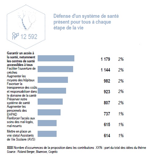 C'est l'heure du bilan. Lundi 8 mars, le Premier ministre Edouard Philippe s'est attaché à faire la synthèse des trois mois de débats qui se sont tenus en France du 15 janvier au 15 mars. Avec un constat : non prévue dans les grands thèmes initiaux, la santé était malgré tout omniprésente. "On voit bien (…) que la thématique de la santé s'est invitée dans les questions que nous avions posées aux Français : l'accès à un médecin traitant, l'organisation, l'accès au tissu hospitalier", a indiqué le Premier ministre dans son discours. "Tous ces sujets sont au cœur des préoccupations des Français, partout sur le territoire." 20 % des idées concernent la santé C'est peu de le dire. Chargées d'analyser les "contributions libres" ayant émergé spontanément dans le cadre du grand débat – cahiers de doléance, réunions locales, courriers reçus… –, le cabinet Roland Berger et les sociétés Bluenove et Cognito estiment que 20 % des idées exprimées ont trait à l'amélioration du système de santé. Sur le thème du pouvoir d'achat, la question la santé se décline en deux demandes majeures : réduire le coût des mutuelles et améliorer le remboursement des soins. Mais les contributeurs sont également attachés à la défense du système de santé, réclamant notamment une augmentation du personnel à l'hôpital et en Ehpad, ainsi que le développement des maisons et centre de santé accessibles à tous.