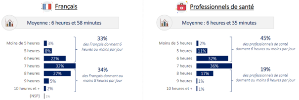 Et 45% d'entre eux dorment même moins de 6 heures par nuit, révèle un baromètre Odoxa. Premier volet d'une enquête consacrée à la parentalité et à ses conséquences en termes de santé, ce baromètre Odoxa pour la MNH dédié au sommeil a inclus un échantillon de 2010 Français et de 580 professionnels de santé représentatifs. Principal enseignement : "Les Français ne dorment pas suffisamment et c'est encore pire pour les professionnels de santé". La moyenne est en effet de 6h58 pour la population générale et de 6h35 pour les soignants. Tandis que 33% des Français dorment 6 heures par nuit ou moins, ils sont 45% chez les professionnels de santé ; 11% dorment même 5 heures ou moins. A l'inverse, seuls 19% des blouses blanches dorment au moins 8 heures par nuit.