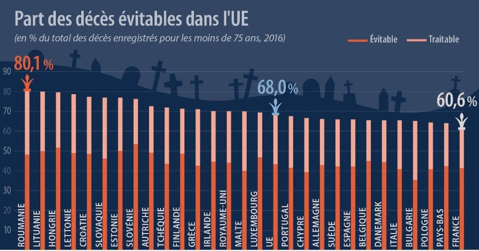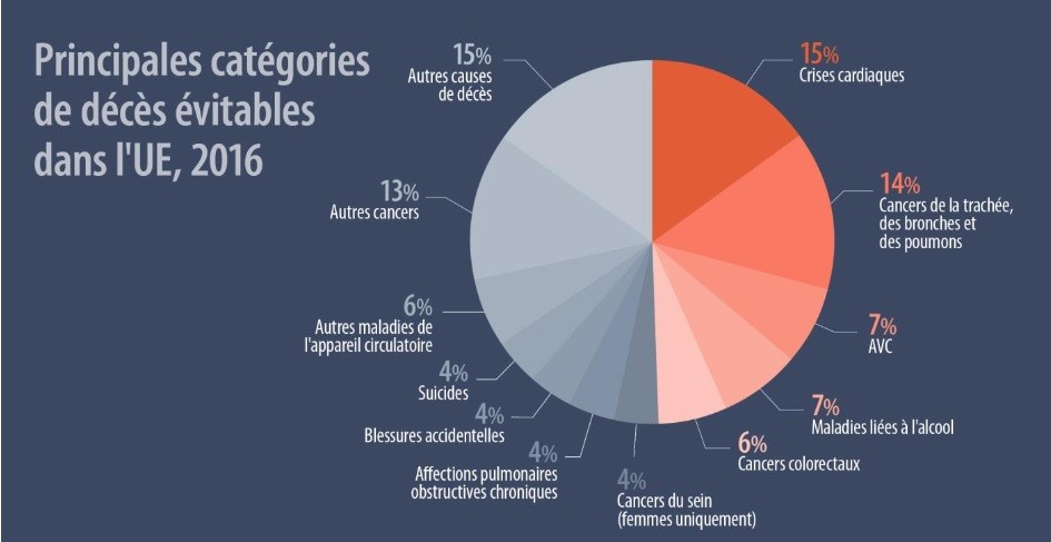 Dans la typologie d'Eurostat, les décès évitables se déclinent en deux catégories bien distinctes : les décès ayant trait à des maladies pouvant être prises en charge par le système de soins et de dépistage (amenable mortality, traduit par "mortalité traitable") et ceux liés aux pratiques de prévention primaire (preventable mortality, approximativement traduit par "mortalité évitable"). Or, les bons résultats de la France sont surtout liés aux performances de son système de soins et de dépistage : les décès prématurés "traitables" ne représentent que 19,3 % de l'ensemble des décès, ce qui place la France en première position devant la Belgique (20,5 %) et le Danemark (21,0 %). En matière de prévention, la France est moins performante et se classe dans le premier tiers du tableau, derrière un trio de tête constitué par la Bulgarie (35,4 %), Chypre (39,2 %) et Malte (39,9 %). Sur l'ensemble des morts prématurées considérées comme évitables en Europe, les maladies cardiovasculaires sont les plus fréquentes (15 %), suivies des cancers des voies respiratoires (trachée, bronches et poumons, 14 %), des AVC (7 %) et des maladies liées à l'alcool (7%).