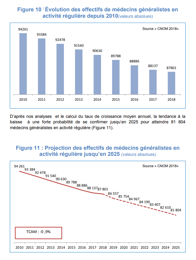 Pour la médecine générale, l'état d'urgence est maintenu. En huit ans, les effectifs des spécialistes en médecine générale, en activité régulière tous modes d'exercice confondus, ont fondu de 7 %, et de 0,4 % entre 2017 et 2018, souligne la dernière édition de l'Atlas démographique de l'Ordre des médecins. On compte 87 801 médecins généralistes inscrits au tableau de l'Ordre, en 2018, sur 198 081 médecins en activité régulière, et 296 755 médecins au total, inscrits au tableau. Urgence d'une réforme en profondeur Et la dégringolade de la médecine générale n'est pas près de s'arrêter. Elle va se poursuivre jusqu'en 2025 où les médecins généraliste, pénalisés par un taux de croissance annuel négatif de 0,9 % ne seront plus que 81 804. D'autres spécialités d'accès direct se trouveront également en grande difficultés, comme l'ophtalmologie, la dermatologie vénérologie qui ne pourront pas procéder au renouvèlement des générations, ou la psychiatrie, qui déserte la médecine libérale (de 41 % à 32 % entre 2010 et 2018).