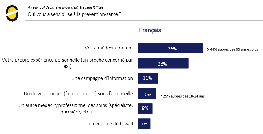 D'après le Baromètre Santé Odoxa sur la prévention santé en France aujourd'hui, les Français sont largement sensibilisés aux principaux conseils de santé publique, souvent par leur médecin. En revanche, le plan de prévention santé d'Agnès Buzyn, censé structurer l'action publique en la matière, demeure largement inconnu, y compris par de nombreux médecins. D'après le Baromètre Santé 360 Odoxa*, l'importance de la prévention en santé fait consensus. Sept Français sur dix (69 %) déclarent y avoir été sensibilisés, le plus souvent (36 %) par leur médecin. La même proportion (71 %) disent d'ailleurs appliquer les bons préceptes de prévention. Dans le détail, on s'aperçoit que les Français les plus sensibilisés sont plus âgés : environ 60 % se disent bien informés avant 50 ans, contre les trois-quarts dans les tranches d'âges suivantes.
