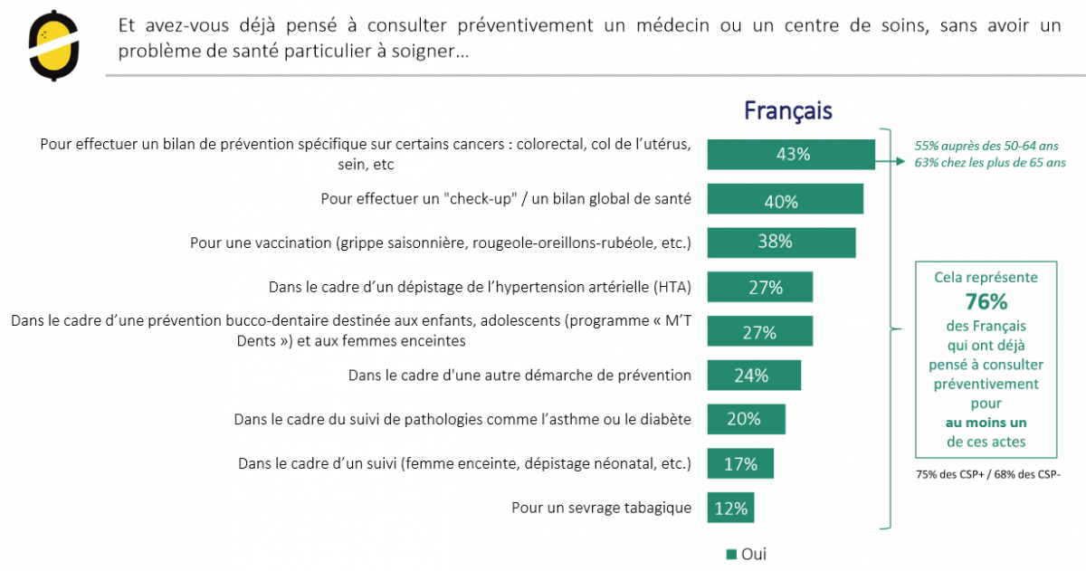 Autre élément encourageant : plus des trois-quarts des Français ont effectué au moins une consultation préventive au cours de leur vie, le plus souvent à des fins de dépistage de cancer (43 %), pour faire un check-up (40 %) ou se faire vacciner (38 %).