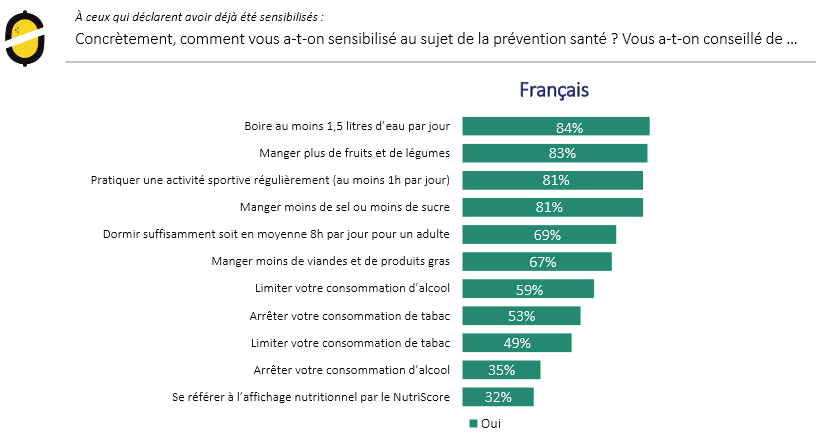 Ces bons résultats théoriques masquent évidemment des disparités, notamment socio-économiques : 63 % des CSP- déclarent appliquer les bons comportements en matière de prévention-santé contre 73 % des CSP+. Dans l'ensemble, on relève un écart constant d'environ 10 points entre les scores CSP+ et CSP- sur l'attention portée à la préservation de la santé, le sentiment d'être bien informé sur le sujet, la propension à appliquer les bons comportements et le recours aux consultations préventives. L'argent premier obstacle déclaré Interrogés sur les principaux obstacles à une meilleure mise en œuvre, les répondants placent en premier lieu le manque de moyens financiers (41 %), suivi du manque de motivation (20 %) et de temps (18 %). Concernant les messages de santé publique auxquels ils ont été sensibilisés, les Français mettent en avant le fait de boire de l'eau (84 %), manger plus de fruits et légumes (83 %), faire du sport (81 %) et limiter les sucres et le sel (81 %). D'autres conseils de prévention sont moins identifiés, comme le fait de dormir suffisamment (69 %), limiter la viande et les produits gras (67 %) ou encore utiliser le NutriScore (32 %).