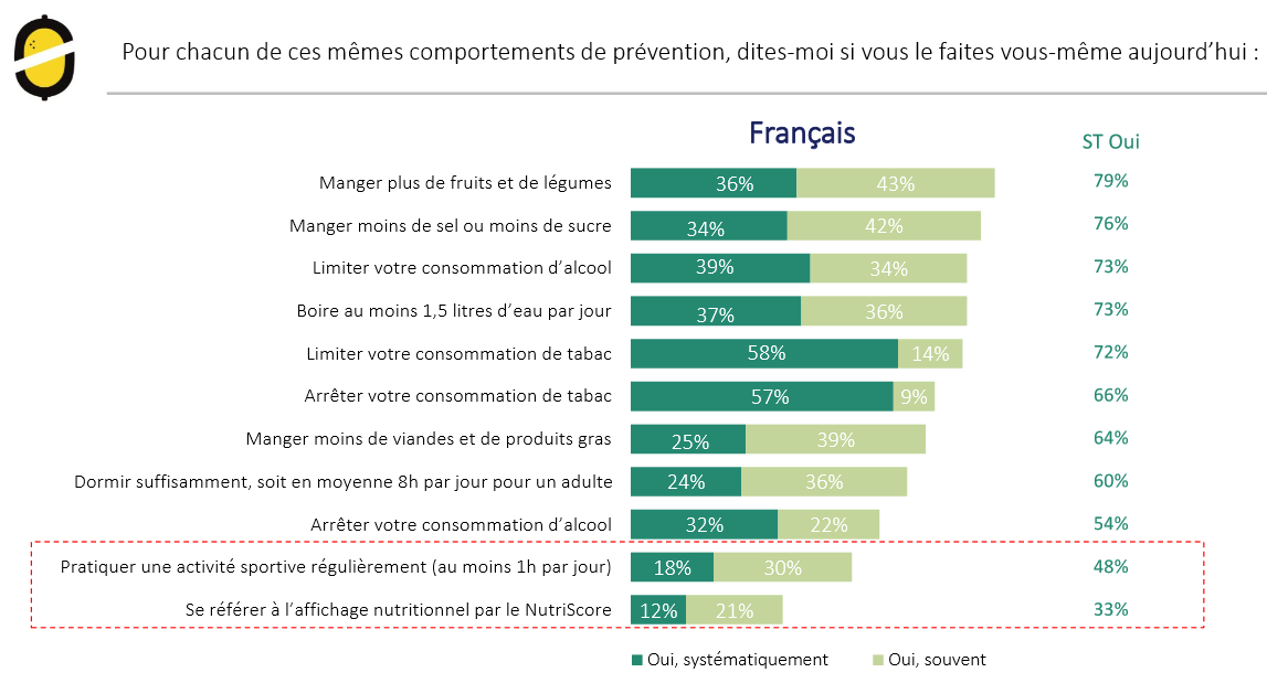 Le passage à la pratique est bien sûr beaucoup plus délicat. Dans les faits, les conseils les moins suivis sont le fait de dormir suffisamment (60 % des répondants déclarent le faire souvent ou systématiquement), arrêter l'alcool (54 %), faire du sport régulièrement (48 %) et utiliser le NutriScore (33 %).