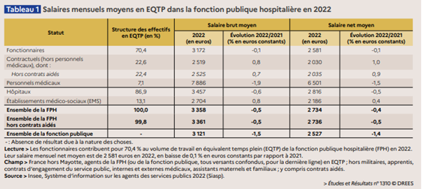 La Direction de la recherche, des études, de l’évaluation et des statistiques (DREES) fait le point sur les salaires dans la fonction publique hospitalière en 2022. Le salaire net moyen baisse de 0,4% en euros constants dans un contexte de forte inflation. Le salaire net moyen s'élève à 2 734 euros par mois pour un équivalent temps plein.